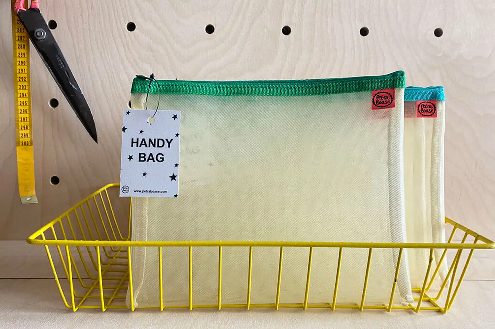 Pale yellow mesh bag with green zip. There are no end of uses for this handy bag… a perfect pouch for all your stationery, an easy to find handbag pocket for phones and keys or a perfect little carrier for little one’s car journey trinkets and treats.