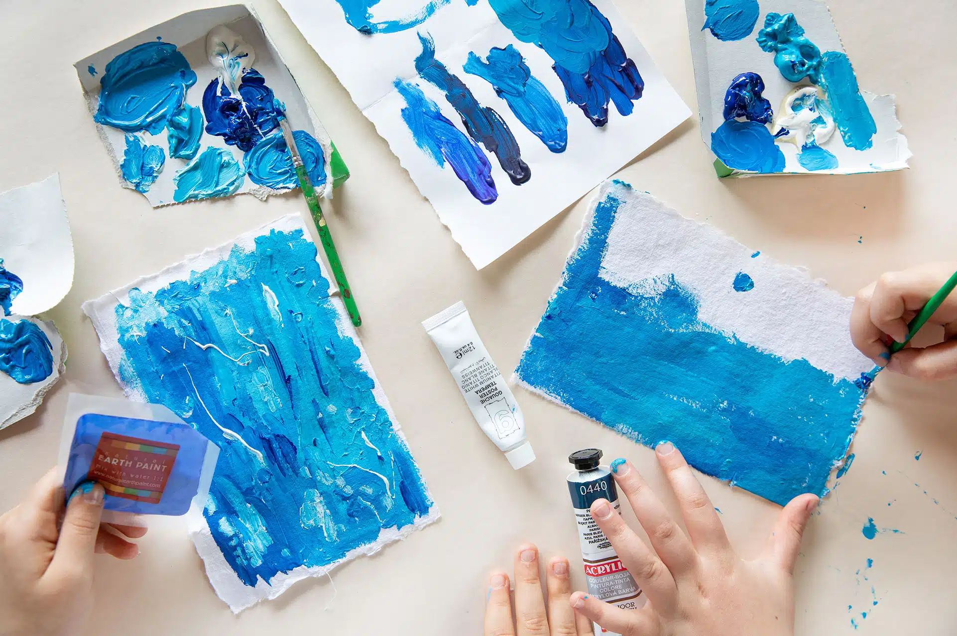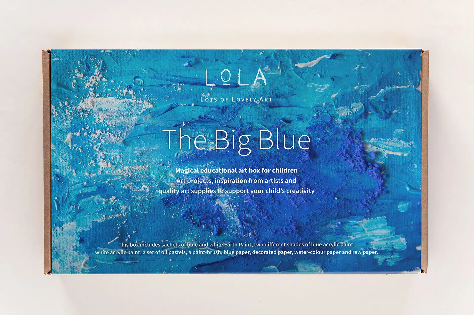This box includes sachets of blue and white Earth Paint, two tubes of different shades of blue acrylic paint, a small  tube of white acrylic paint, a set of oil pastels, a paint-brush, blue paper, decorated paper, water-colour paper and raw paper.